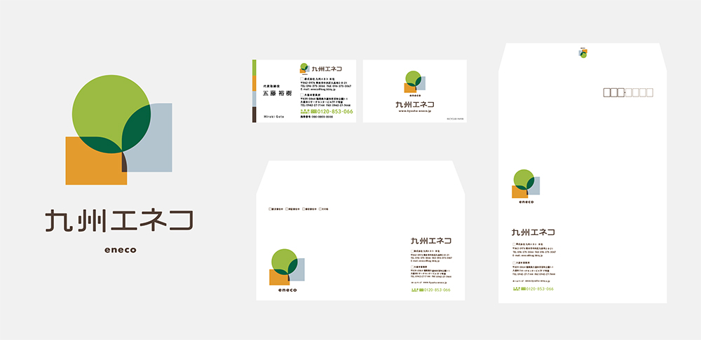熊本市にございます株式会社九州エネコさまロゴマーク。オール電化を扱われる会社で、マークは3つの色で構成しました。明るさや安心感をイメージさせるオレンジ、企業姿勢を表す明るいグレー、守るべき環境(地球)をイメージしたグリーン。この3つの色が重なり合ったシルエットで「エコ」を想起させる双葉を出現。電気によって生活の豊かさを得ながら、私達が日常で何気に行っていることが「これからの地球を守る」「エコロジー」につながり、その感覚をお客様と一緒に共有し、再確認する気持ちを込めました。