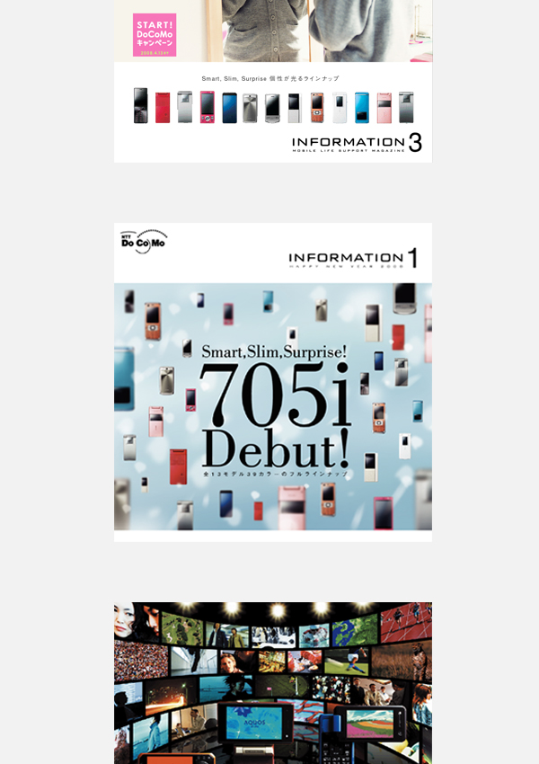 中国地方のドコモユーザー200万世帯に配られる冊子「INFORMATION」の制作。毎月の請求書に封入し、新登場の端末や新サービスの情報を訴求。約2年間、コピーライター中村氏と一緒に毎月の広島でのお打ち合わせはとても刺激になり、私を大きくしてくれた思い出深いお仕事のひとつです。