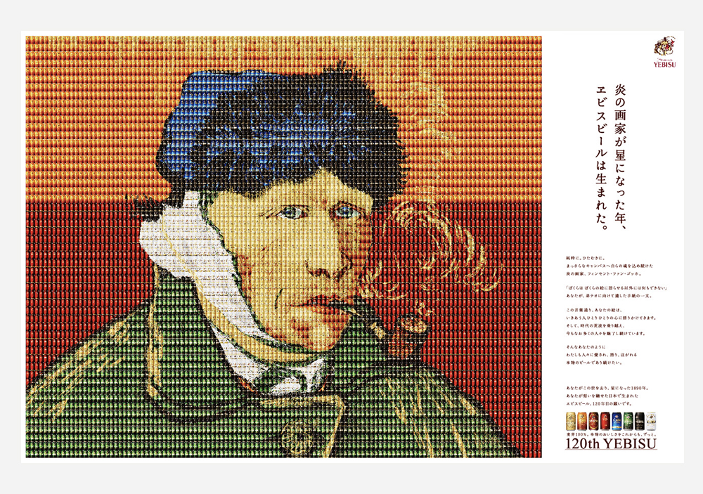 読売広告大賞一般公募の部にて協賛社賞を受賞。年に一度の日本三大広告賞のひとつで、私のデザイナー人生の目標のひとつでもありました。120年目を迎えたヱビスビールと、没後120年のゴッホという運命の時間軸で交差する2つを全商品ラインナップで表現。この作品で、チャレンジし続けることの大切さを改めて学び、そしてとても大きな自信につながりました。