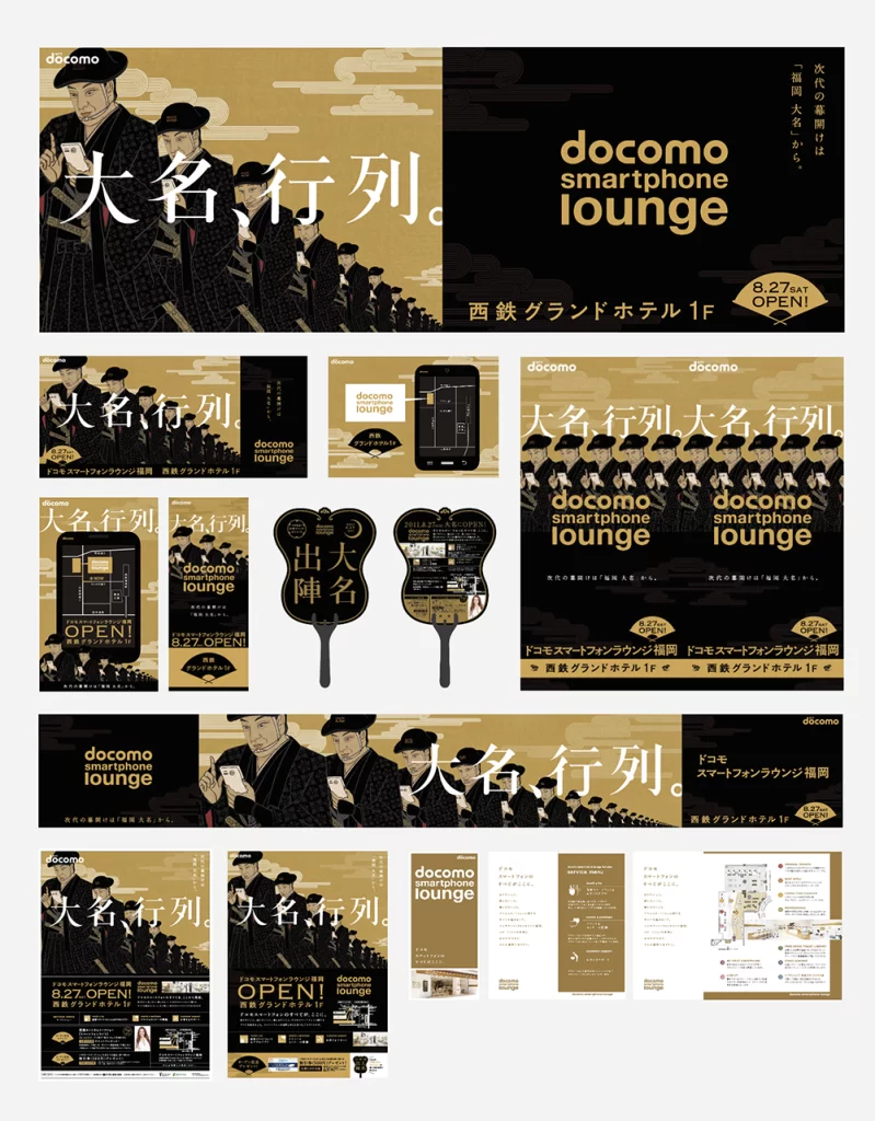 九州初上陸、NTTdocomoさまのスマートフォン専門店オープニングプロモーションに参加。西鉄コンコース~天神ジャック広告&ラウンジ店舗内ツールのアートディレクションとデザインを担当。なかなかのプレッシャーでしたが、企画会議でのコピーライター中村氏の「大名、行列。」のコピーを見た瞬間に「イケる!」と確信しました。結果、クライアントにもご好評をいただき、ミカドヤの忘れられないお仕事となりました。10年経った今でもこの広告を覚えている方がいらして、「あの大名行列の方ですか!」と行く先々で言われます。