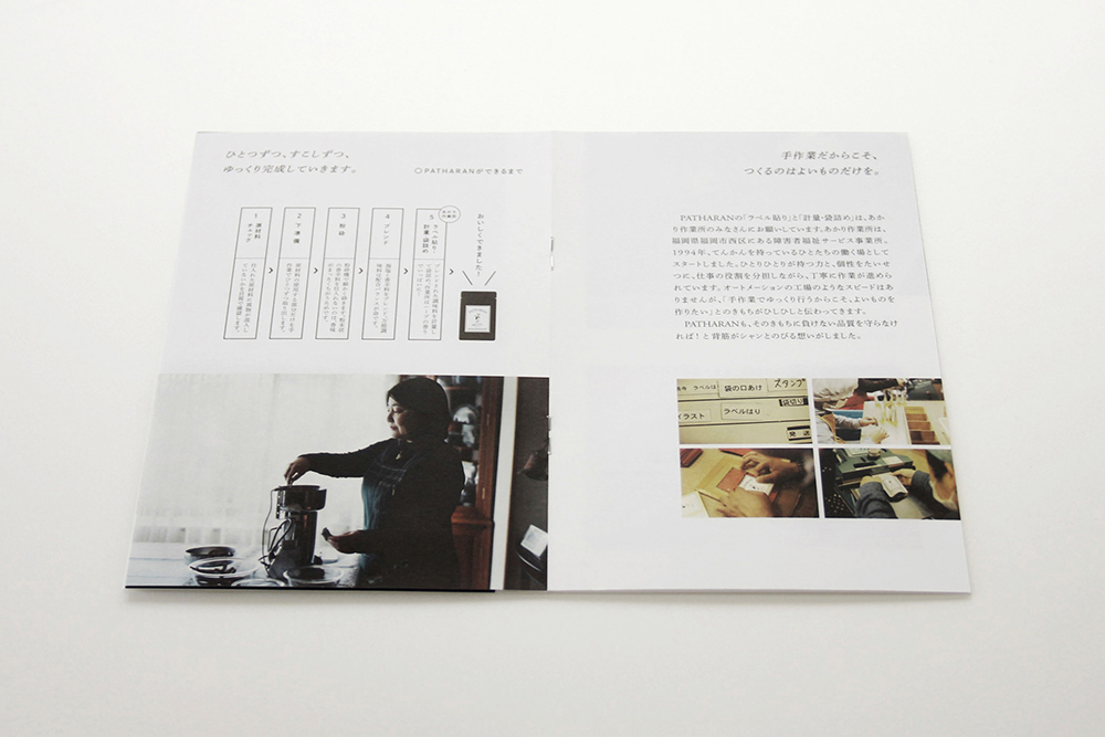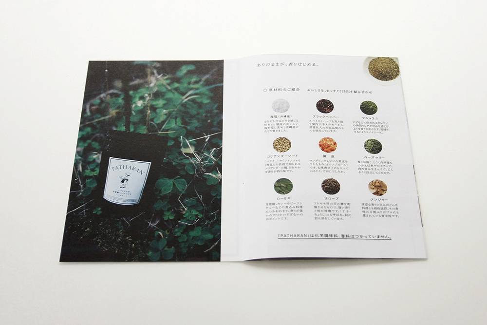 ハーバリストの自家製ハーブソルト『PATHARAN』ミニパンフレット。イベント配布用として商品発売と同時に制作。どういった経緯、想いでこのソルトは作られたのかが一目で分かる構成にしつつ、原材料のスパイスひとつひとつの効能をわかりやすく解説。カメラマン古庄さんが銀塩カメラで挑んでくれた写真と相成って「PATHARANがなぜこんなに深い味わいなのか」が伝わる一冊になっております。