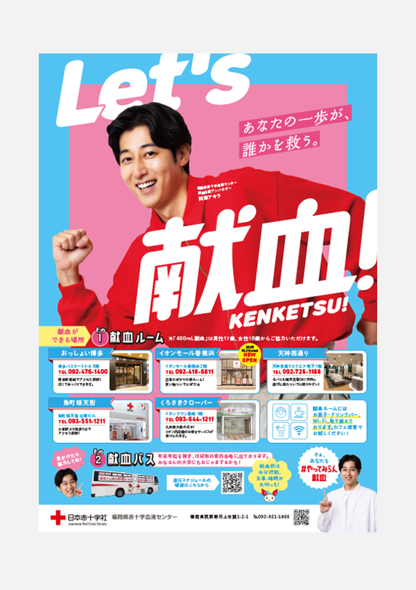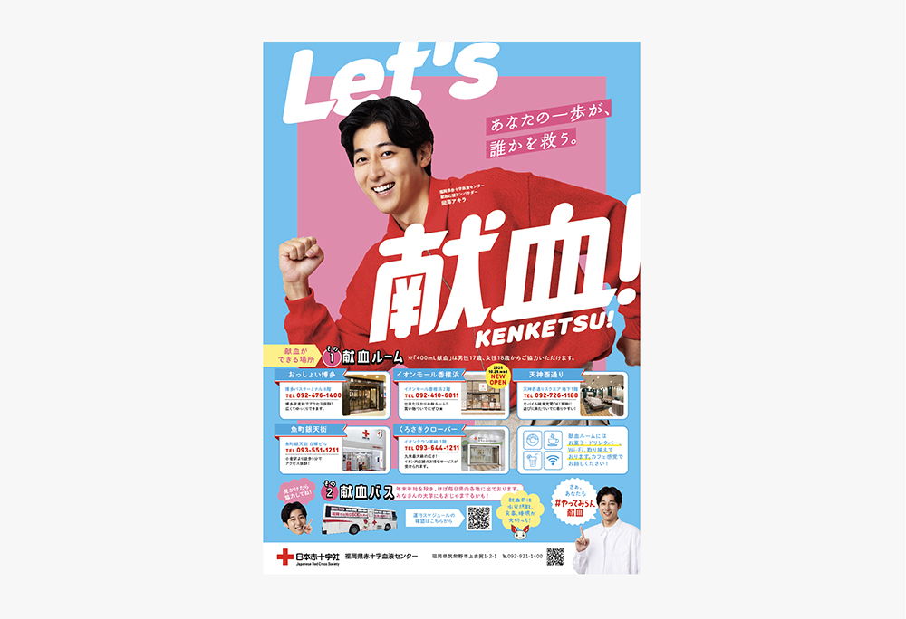 日本赤十字社・福岡県赤十字血液センターさまより、通年で使用される献血促進のビジュアル制作を担当。実は私も献血にはできる限り参加している側なので、今回のご依頼はとても嬉しく、喜んでお受けいたしました。