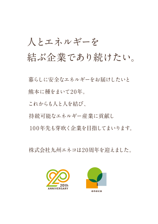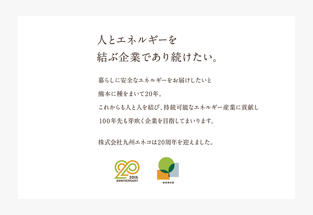 KYUSHU ENECO / 20th Anniversary message 熊本県熊本市にございます株式会社九州エネコさまの20周年記念マークのご依頼。ロゴマークに込めた想いとこれまでのお客さまへの感謝の気持ちをアニバーサリーメッセージとして展開。 CopyWriter:Miwako Ienaga 2026年3月7日 投稿先 コピーライティング, 全て ← 過去の投稿へ コメントを残す コメントをキャンセルメールアドレスが公開されることはありません。 ※ が付いている欄は必須項目ですコメント ※ 名前 ※ メール ※ サイト 次回のコメントで使用するためブラウザーに自分の名前、メールアドレス、サイトを保存する。 上に表示された文字を入力してください。 Δ